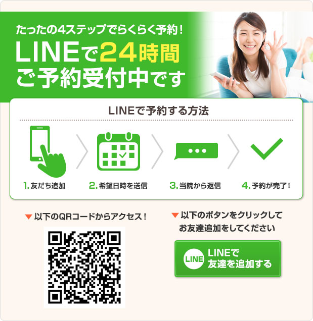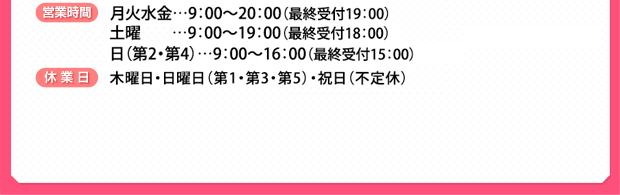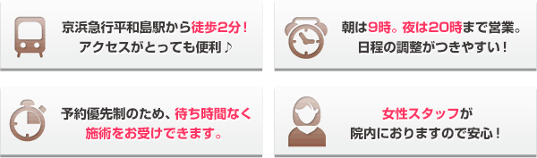 時間がないあなたのために、朝は9時から夜は20時まで営業しています。また、赤ちゃんを家に一人で置いていけないというママさんでもお気軽に来院できるように、ベビーベットやプレイマット・保育士・シッター在籍なのでご安心下さいませ。